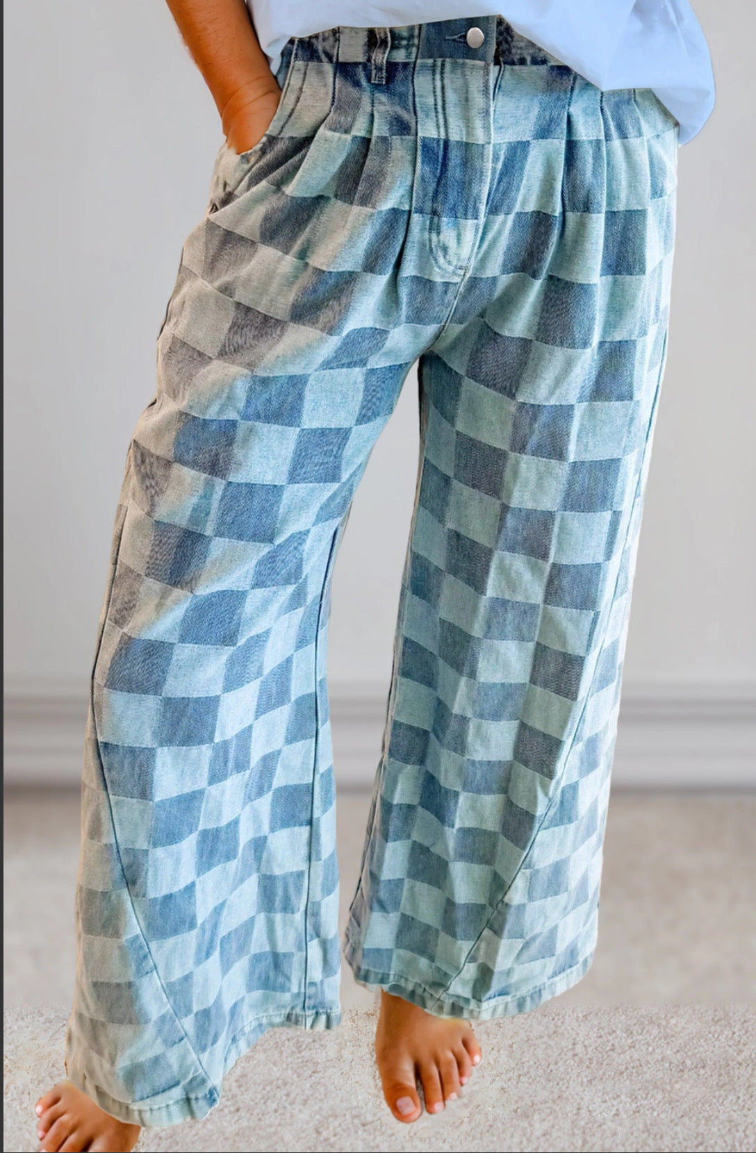 Blue checkered wide leg denim jean. 50 polyester and 50 cotton.
