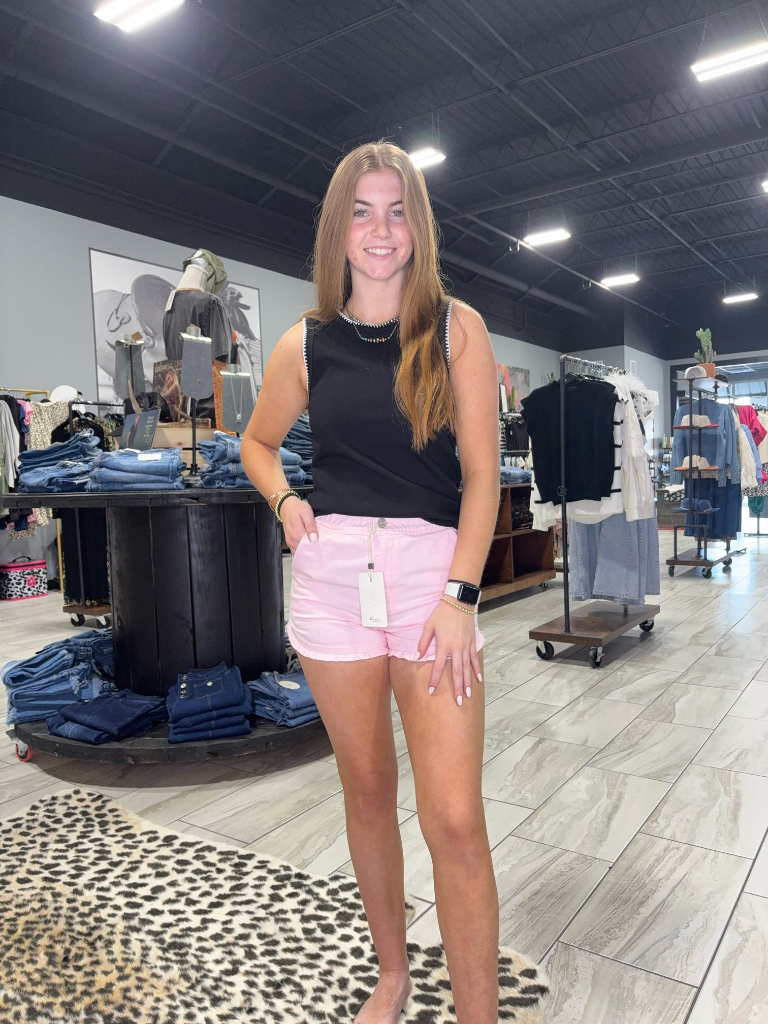 HIGH RISE SHORTS PINK COLOR RIGID ELASTIC WAISTBAND RUFFLE EDGE HEM ZIPPER FLY SLANT POCKET BACK DART RISE