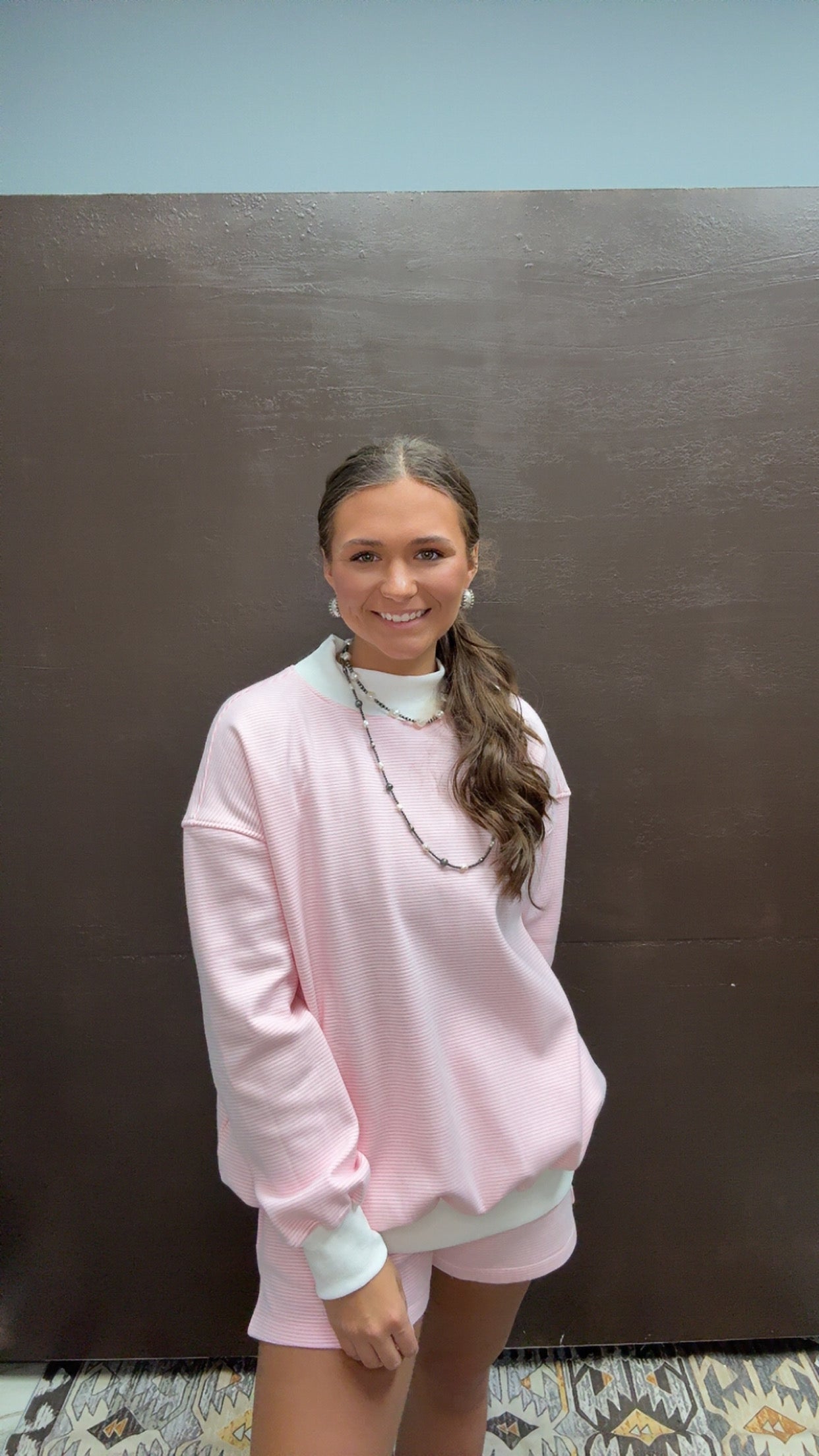 Turn heads in this playful yet polished pink striped set, featuring a sleek mock neck top and matching high-waisted shorts. The soft, breathable fabric keeps you comfy while the bold stripes add a touch of sporty-chic flair. Perfect for sunny days, weekend outings, or casual brunch dates, this coordinated set brings effortless style with a fun, feminine twist. Wear it together for a standout look or mix and match with your wardrobe favorites.