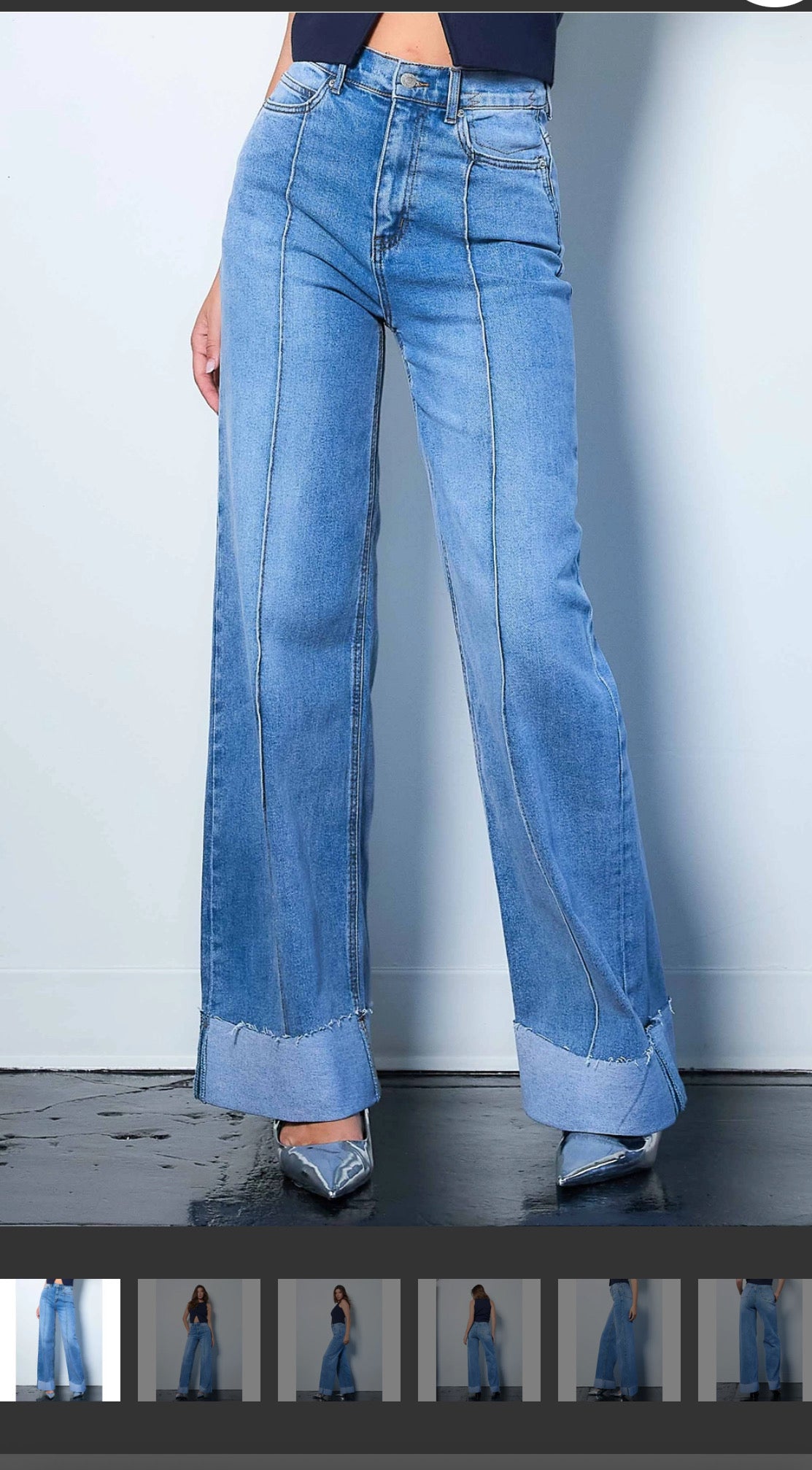 A pair of high rise wide jeans with a folded cuff. Seam detail
