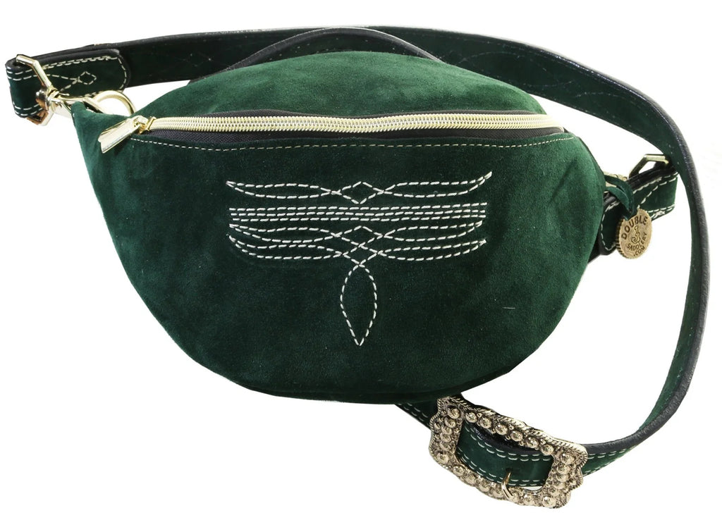 Suede with cream boot stitch on front. Cream figure 8 stitching on long adjustable strap.