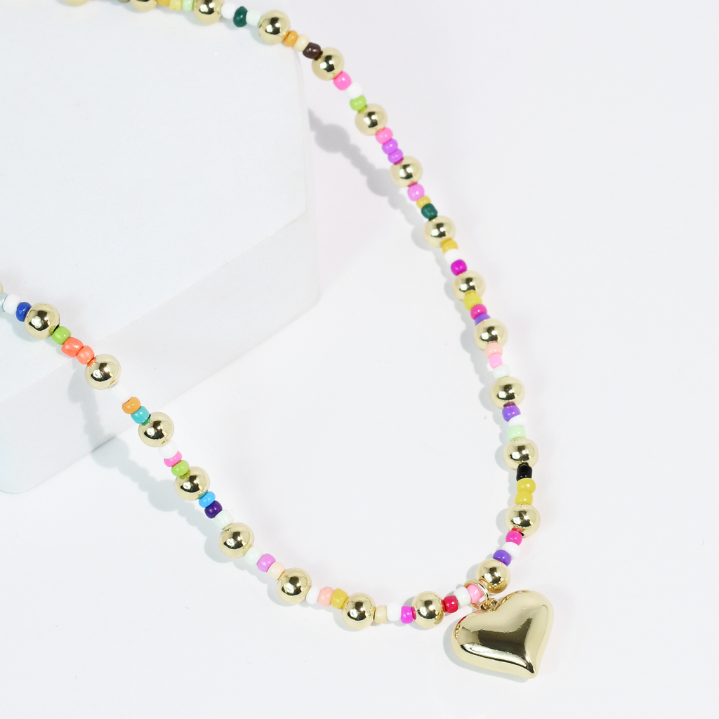 Add a little sparkle and a whole lot of love to your look with our Pop of Love Necklace. Featuring a shiny gold heart charm paired with playful, colorful beads, this necklace is the perfect mix of sweet and fun. Lightweight and eye-catching, it’s designed to bring a cheerful pop to any outfit—whether you’re dressing up or keeping it casual.