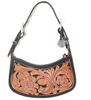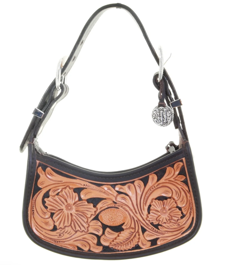 Sheridan Daisy tooling on natural leather. Chocolate Chap gusset and trim. 1 1/4" Adjustable Strap with Texas Whirlwind Brown Vintage Leather. Adjustable Buckle on each end.