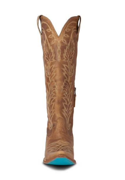 Featuring a convenient side zipper, these knee-high boots are easy to slip on and off, while the pull tabs and slightly distressed finish give them a well-loved, authentic feel. The pointed toe and classic Cuban heel provide a flattering silhouette, and the signature Lane turquoise sole adds a unique pop of color with every step.