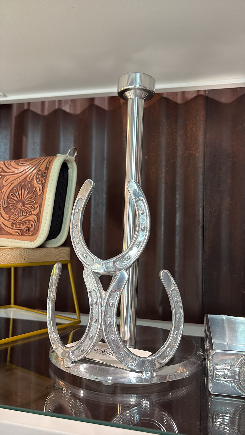 The item is a paper towel holder crafted in silver-toned metal, giving it a polished, sleek appearance.The horseshoes may be embossed, cut-out, or sculpted, providing a decorative and thematic accent that complements the functional design. The combination of shiny silver metal with the symbolic horseshoes creates both a practical kitchen accessory and a charming, rustic-inspired decor piece.