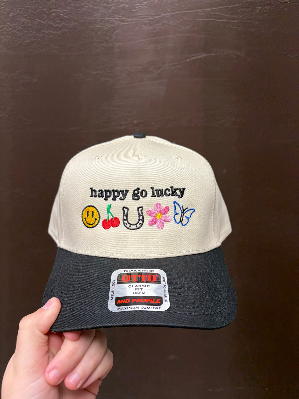 The Happy Go Lucky Trucker Hat is a casual, playful hat with a classic mesh back, adjustable fit, and cheerful design, perfect for sunny days and effortless style.