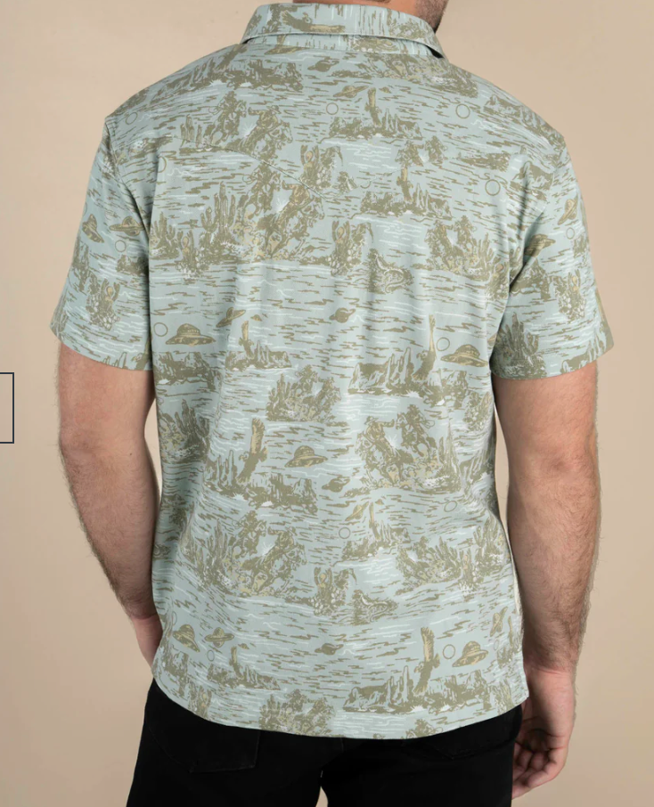 The westernmost polo this side of the Mississippi. The Westernerst polo features a retro pique knit, complete with Western-shaped pockets, yokes, and pearl snaps. Western inspired branding and, of course, a print to boot.