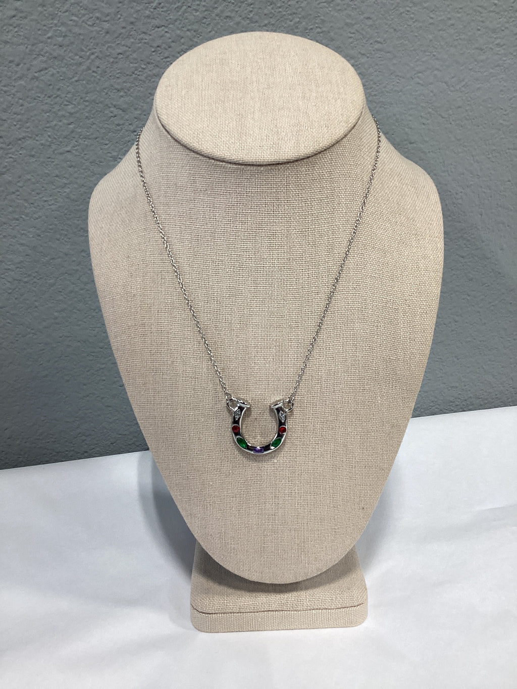 This charming necklace features a silver horseshoe pendant, elegantly crafted with a polished finish. The horseshoe is adorned with vibrant, multicolored crystals, carefully arranged to catch the light from every angle. Each crystal sparkles individually, creating a playful, eye-catching rainbow effect.