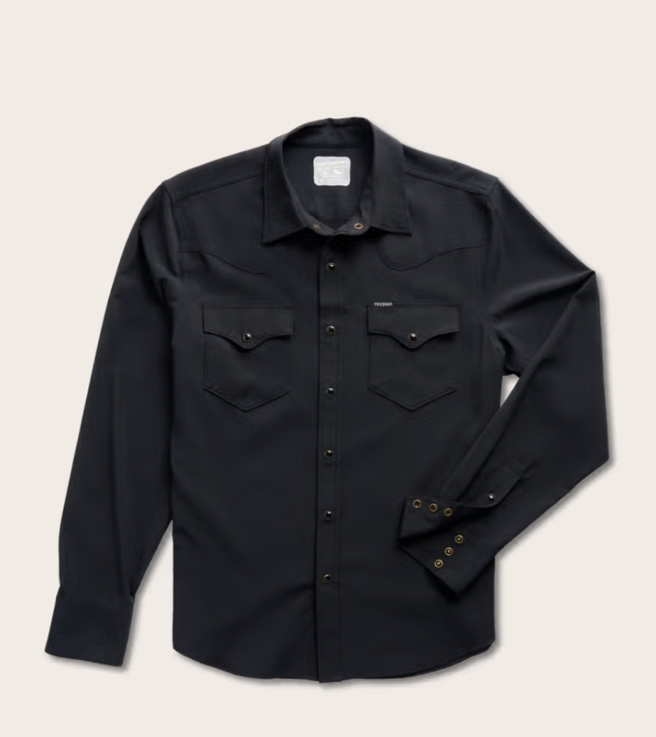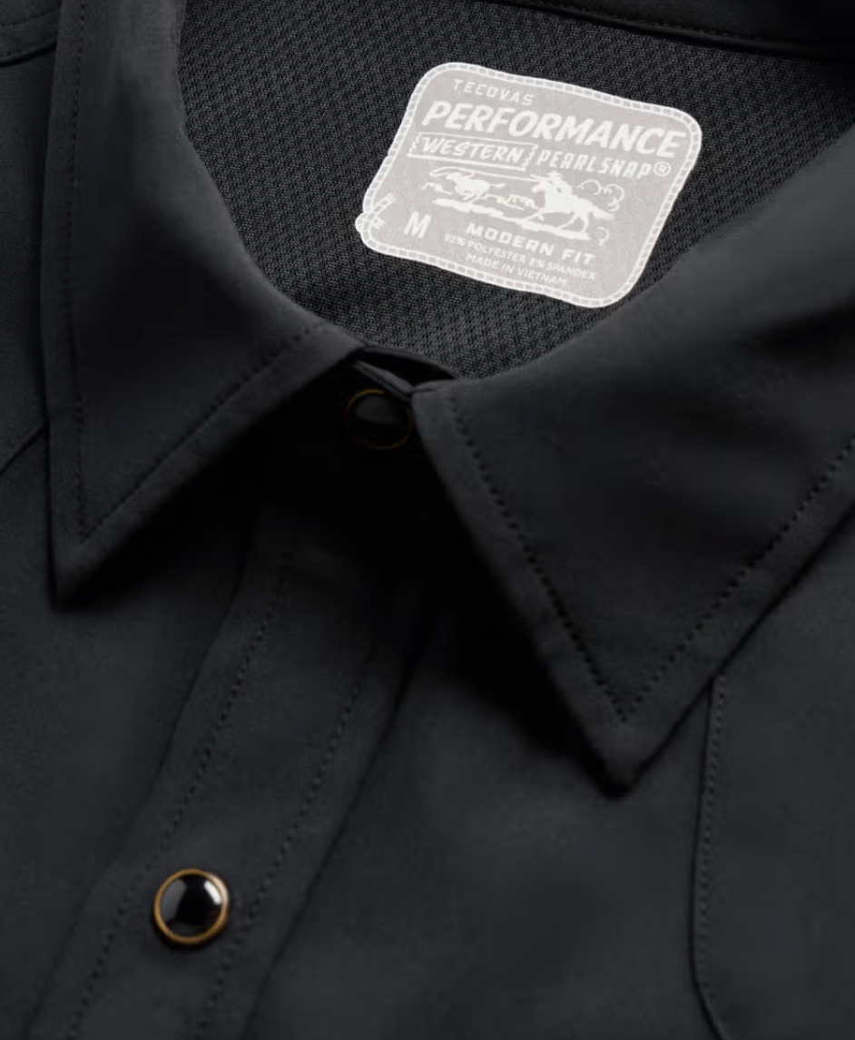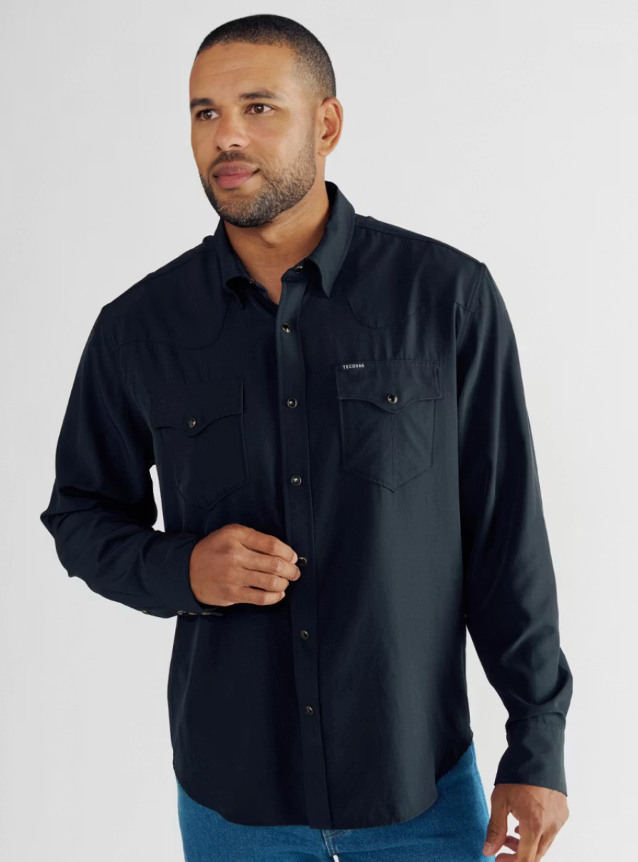 Made with a moisture-wicking polyester/spandex blend with plenty of stretch and wrinkle resistance, this garment is a sun specialist with a UPF50+ rating. It features a ventilated back yoke for extra breathability. Additional hot weather adaptations include a hidden sunglass wipe on the interior placket and a slot to stow your sunglasses on the chest pocket. It makes looking good easy with twin front pockets featuring subtle T-Brand detailing, all secured with antique brass-accented faux horn pearl snaps.