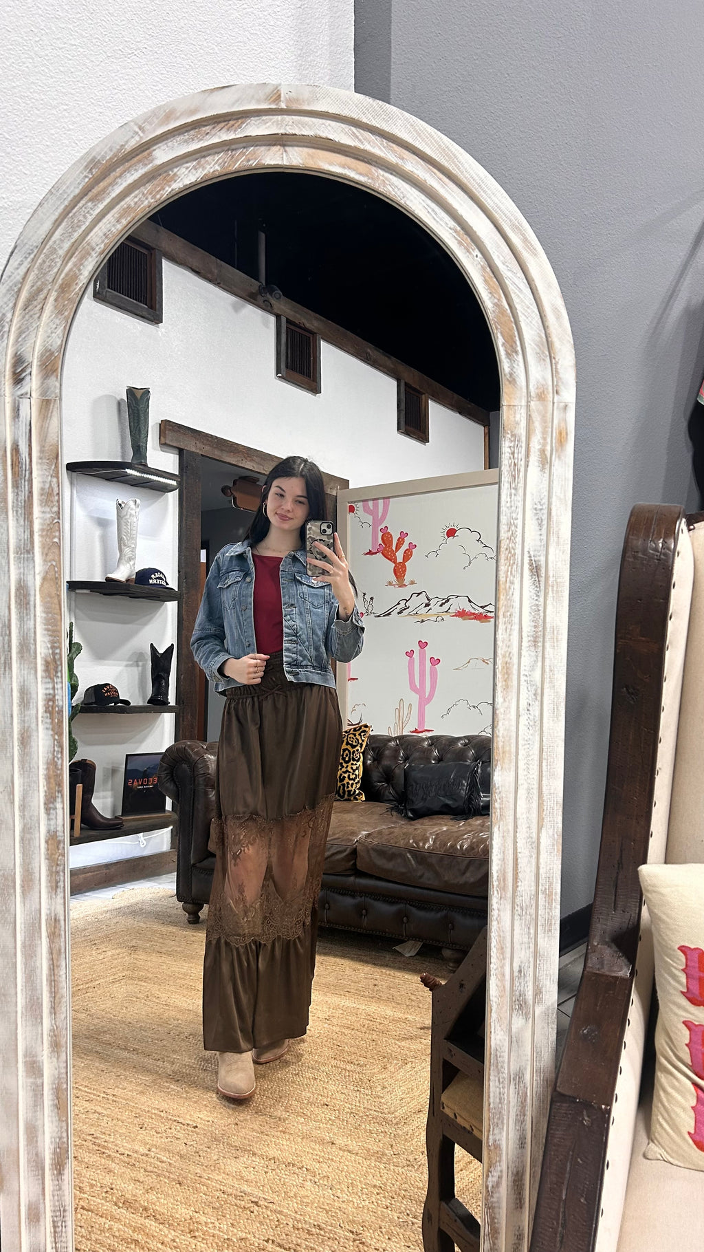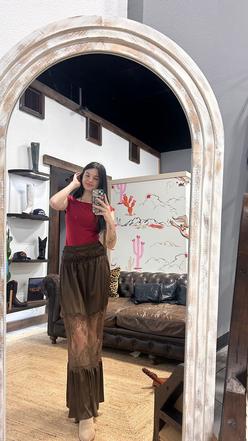 Romantic boho- style maxi skirt featuring soft flowy satin with sheer floral inlay.