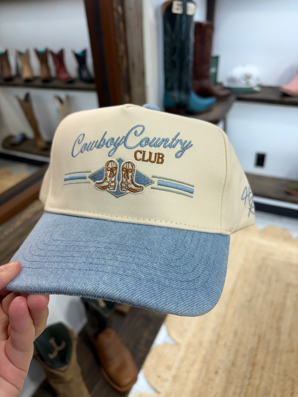 The Cowboy Country Club Denim Trucker Hat is a casual, western-inspired cap made from durable denim, featuring a structured front, and an adjustable fit for everyday wear.