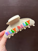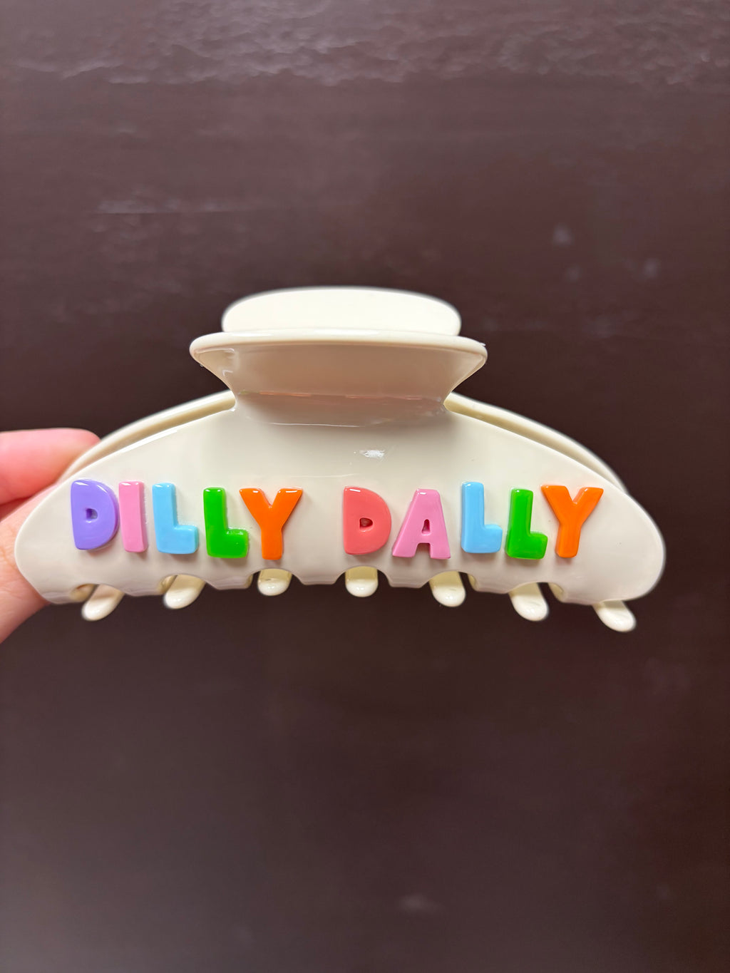 A tan hair clip featuring colorful letters that spell “Dilly Dally,” combining a neutral base with fun, vibrant accents for a playful and eye-catching accessory.