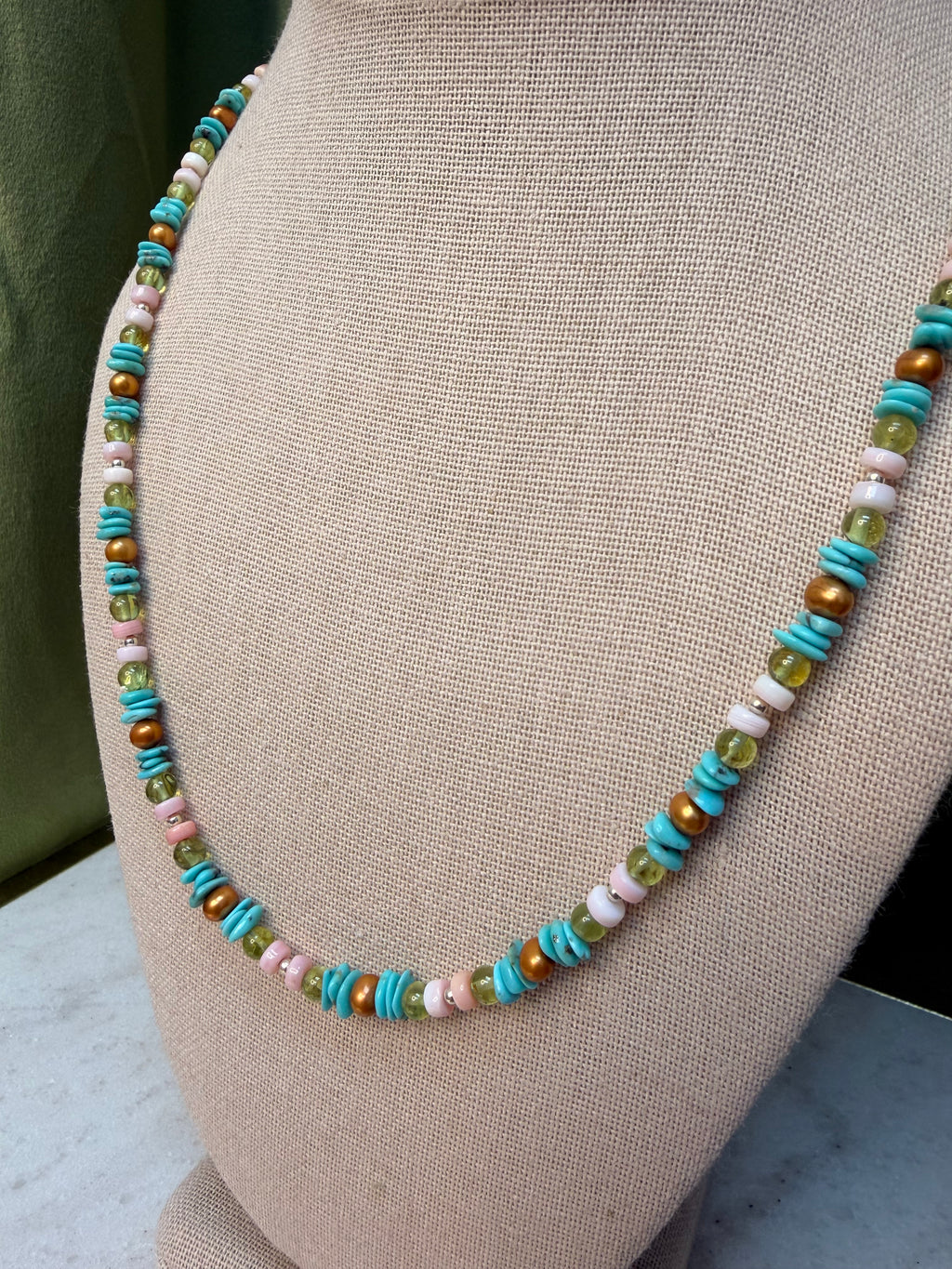 Pink Conch, Turquoise, Green & Cooper Beaded Necklace - 18"