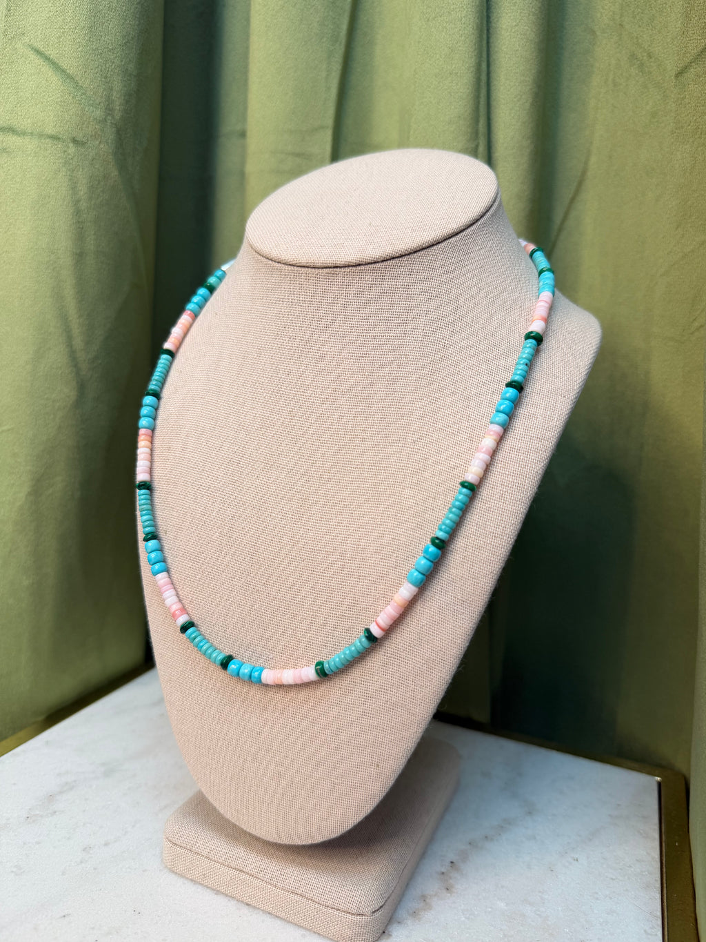 Turquoise , Pink Conch & Green Beaded Necklace - 18"