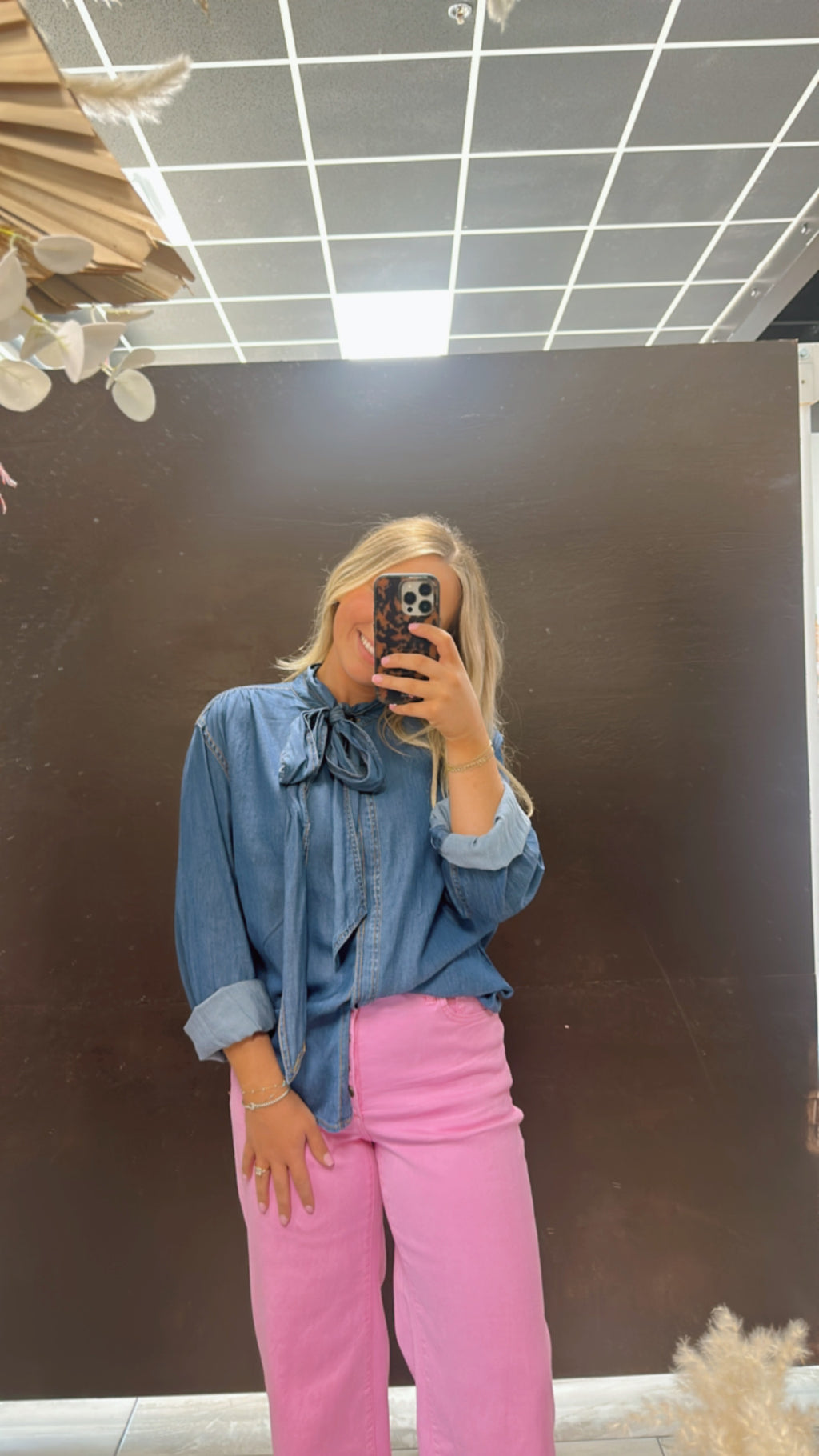 Soft cotton Tencel blend chambray blouse featuring a tie neck, hidden button closure, and long sleeves with button cuffs. Designed with a relaxed fit for effortless styling. 65% Cotton 35%