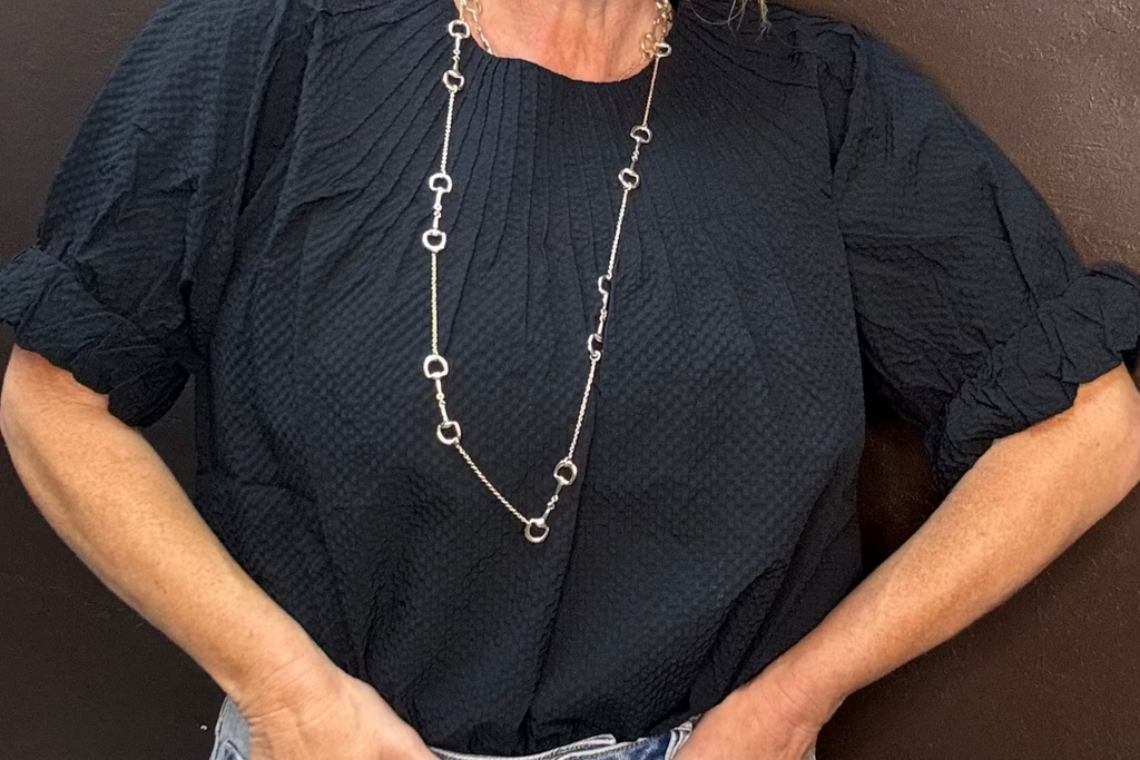 A chic puff sleeve black textured blouse. A western but modern vibe.