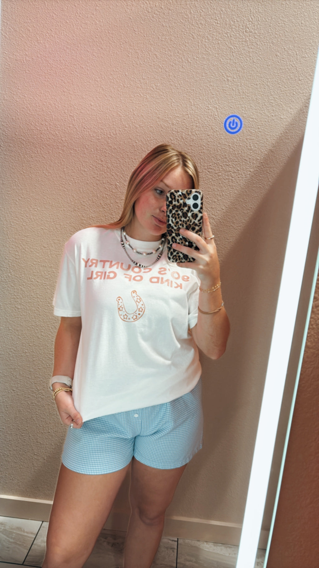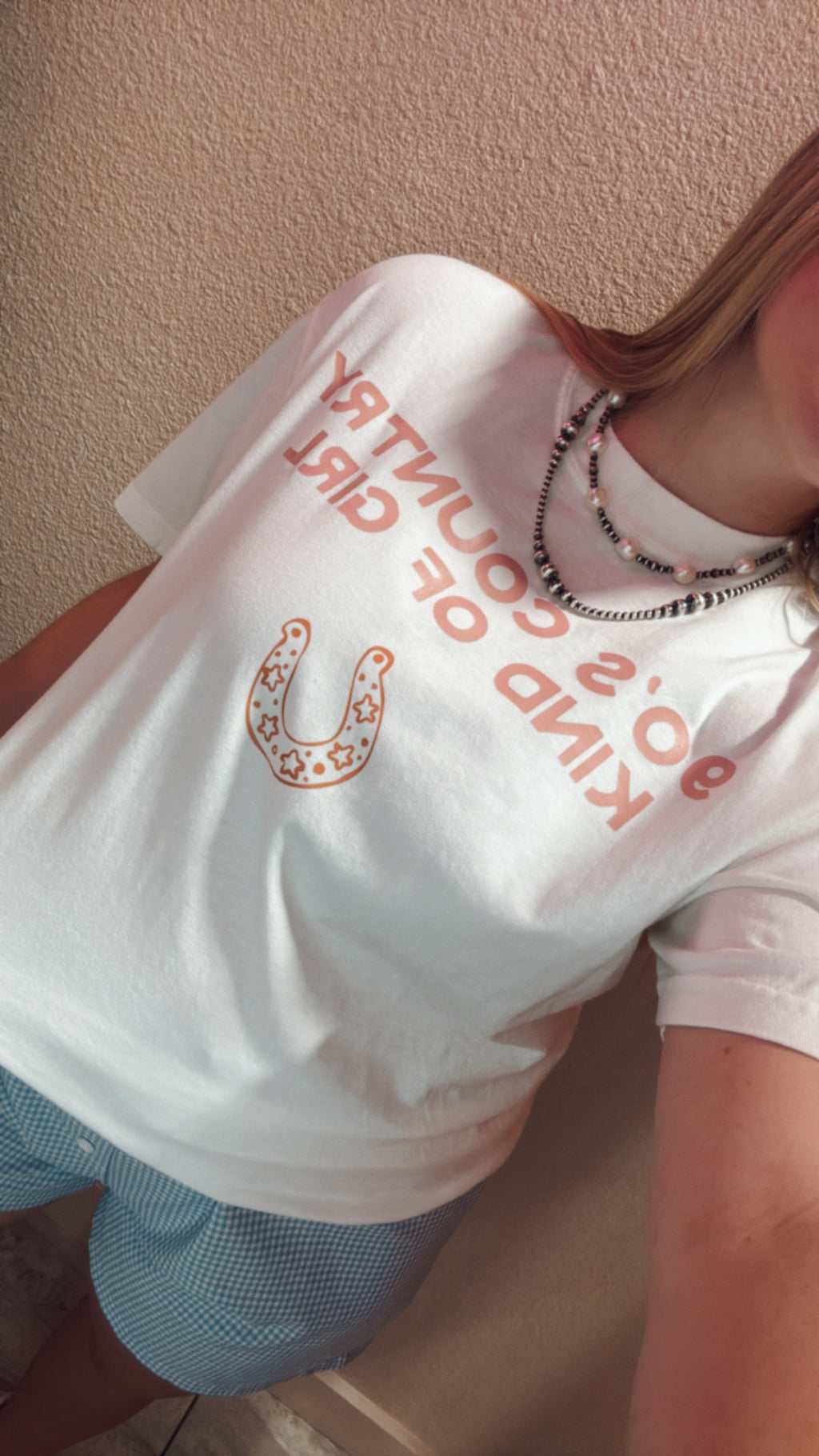 a casual white tee with a vintage vibe. It features the phrase "90'S COUNTRY KIND OF GIRL" in a bold, retro font, with the text in a warm red-orange color. Beneath the text, there are two small graphic cowboy boots, adding a fun Western touch. The shirt has a relaxed, slightly oversized fit with rolled-up sleeves, giving it a laid-back and stylish look. This design captures a nostalgic 90s country aesthetic, blending trendy fashion with country charm.