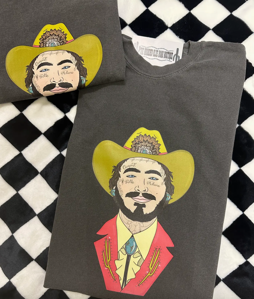 This dark gray T-shirt features a bold, retro-style graphic of Post Malone illustrated in vibrant colors.