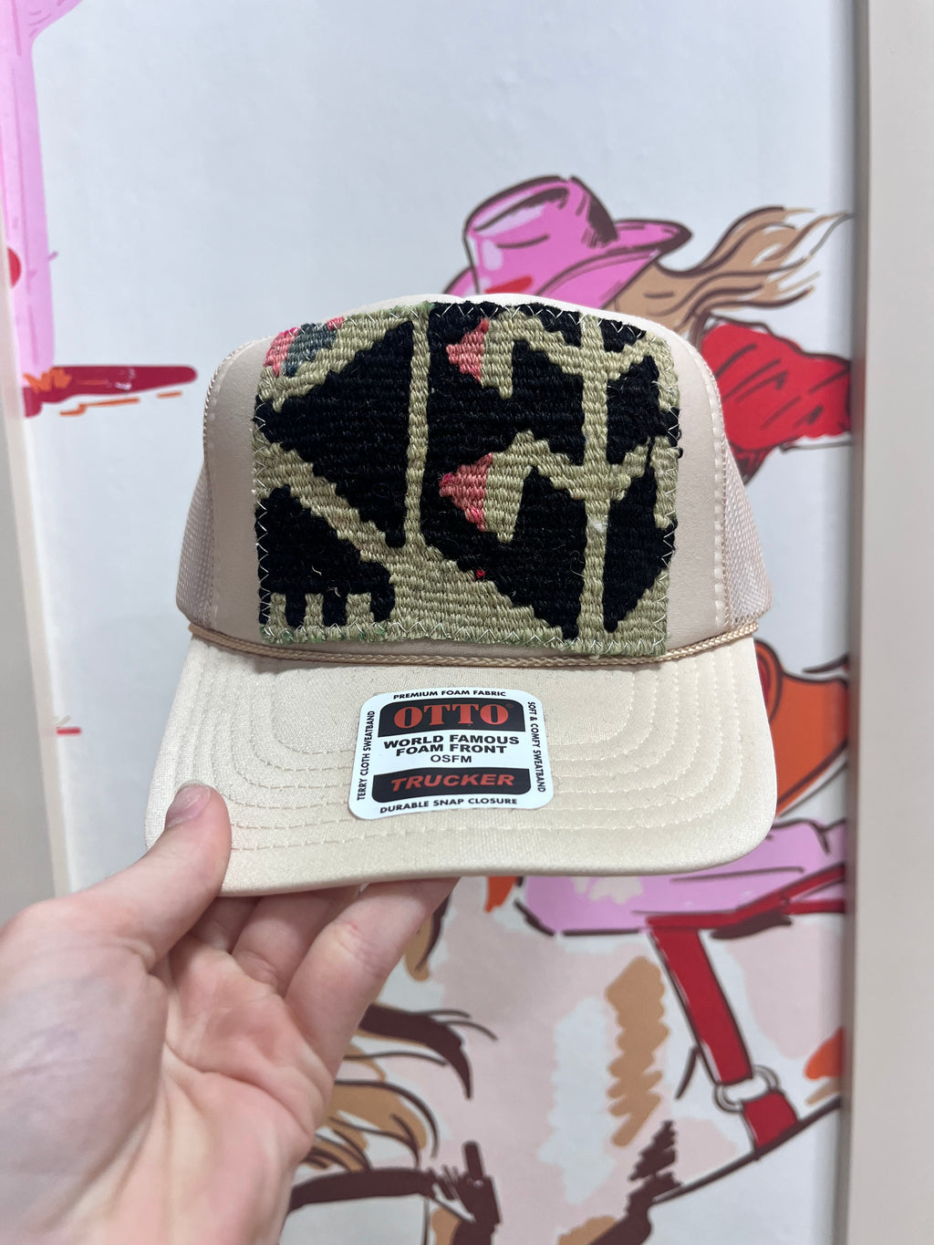 Our easy, throw-on-and-go, trucker hat with Turkish kilim patch. No two are alike! Truckers are one size hat with high crown, structured bill and mesh back with adjustable snaps.