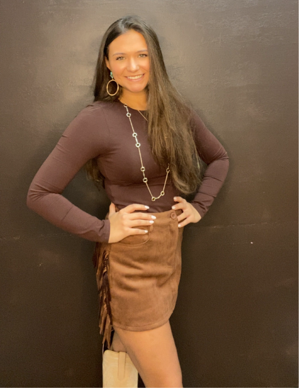 Wrap yourself in it, where rich brown meets suede meets playful fringe. This skirt isn’t just a garment; it’s a dance of texture and movement.