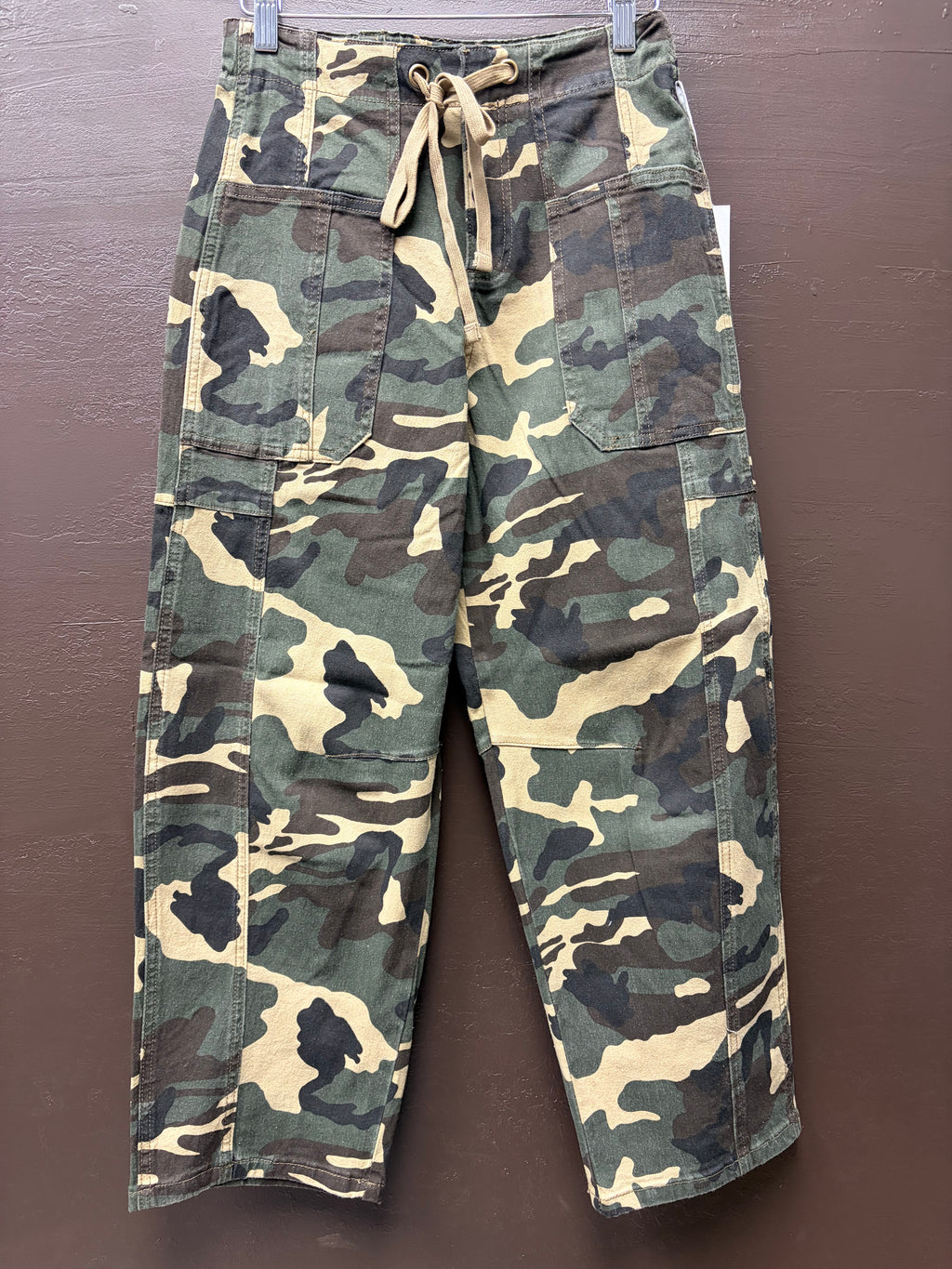 Risen Barrel Jeans in camo feature a relaxed, wide-leg fit with a classic camouflage print, combining a casual, edgy style with comfortable, modern denim.