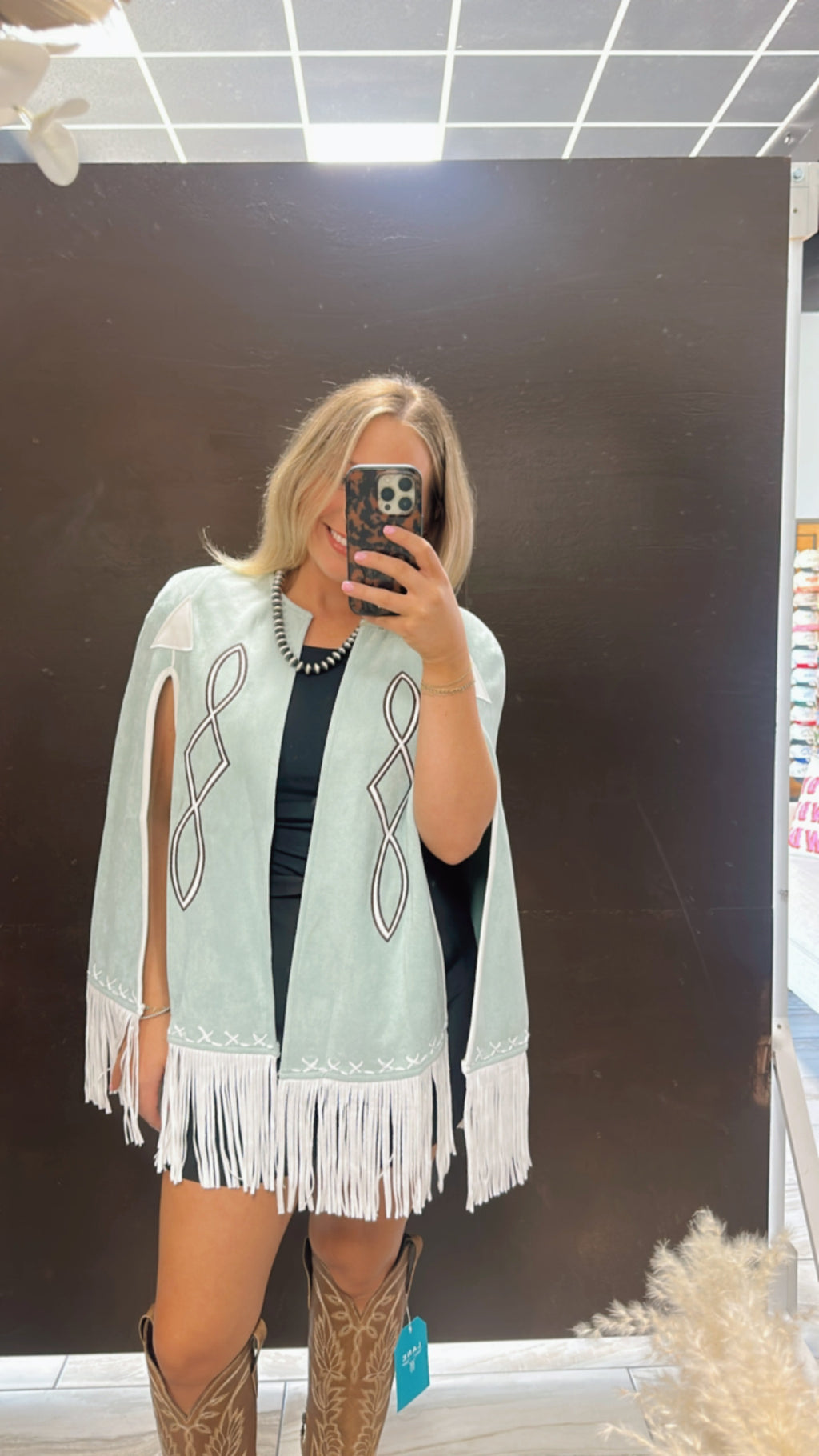 Open cape jacket with fringe hem and embroidered details. Perfect for adding a touch of Western style to any outfit 95% Polyester, 5% Spandex