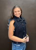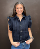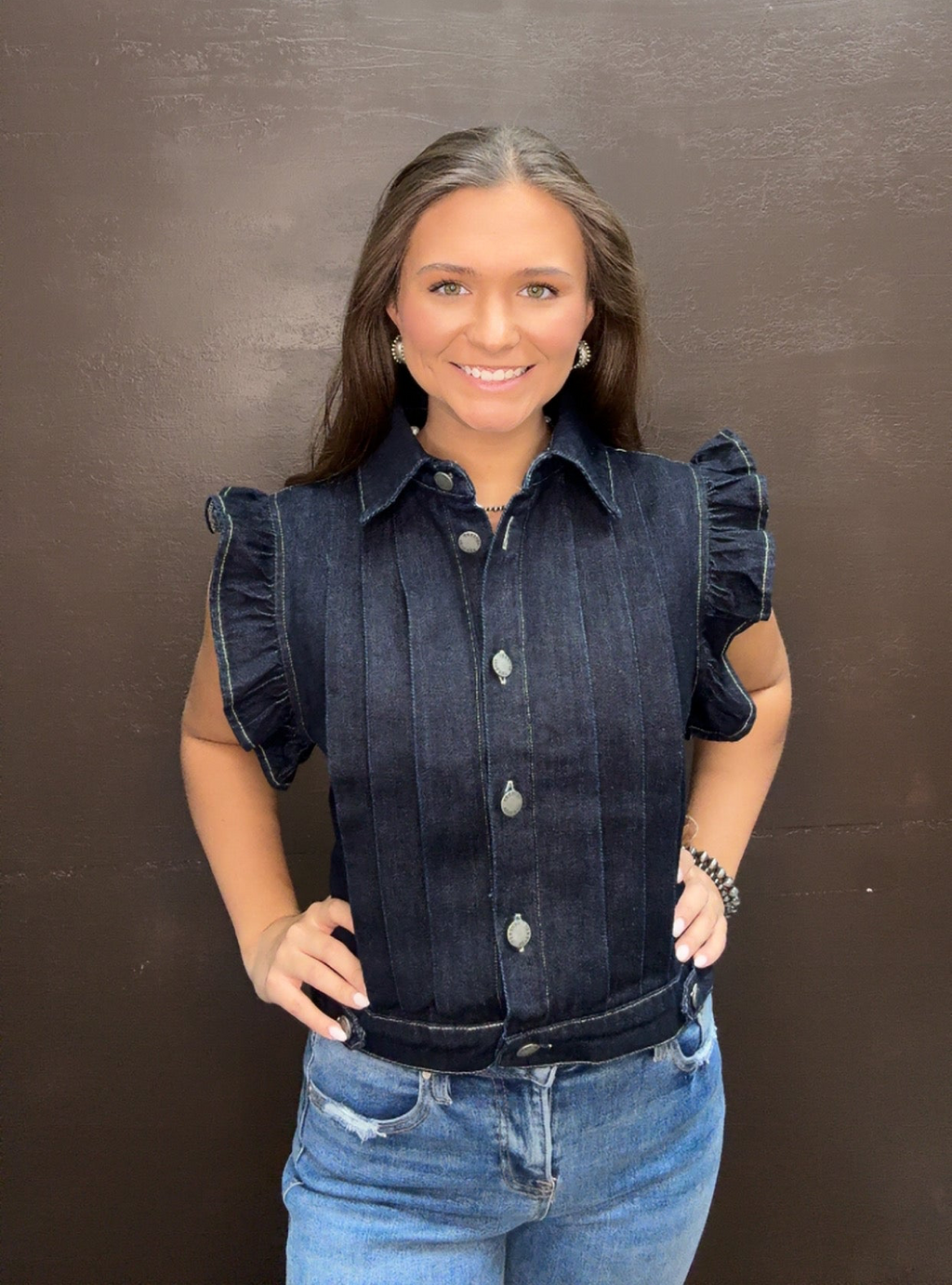 Rugged denim vest with front pleats and a slight ruffle trim for a feminine touch.