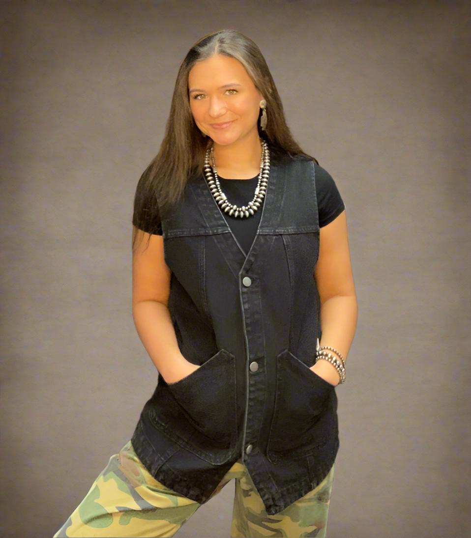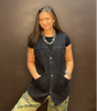 Denim button vest with front pockets. Long enough to wear with leggings. A bit oversized.
