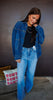 This jacket is a structured, medium-to-dark wash denim piece with a boxy, utility-inspired silhouette. It features minimalistic stitching, oversized patch pockets, and a button-up front with exposed seams that give it a clean yet rugged vibe. The straight hem and slightly dropped shoulders add to its relaxed, vintage feel.