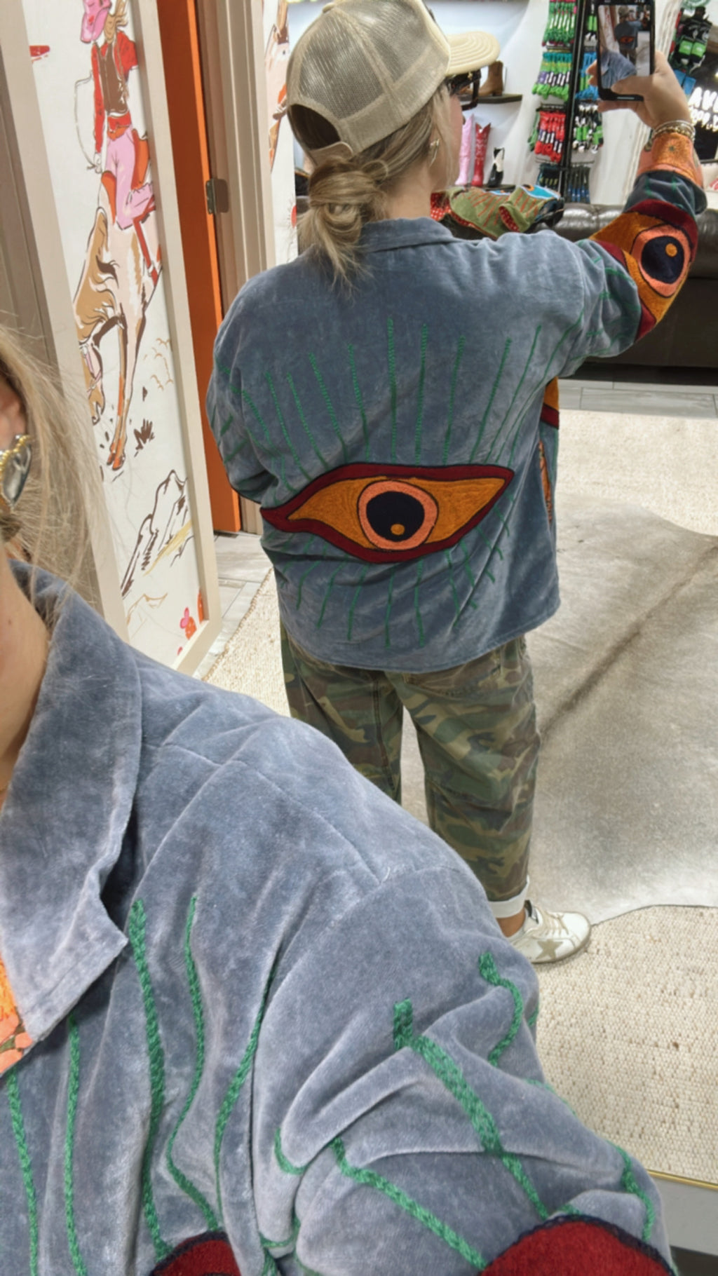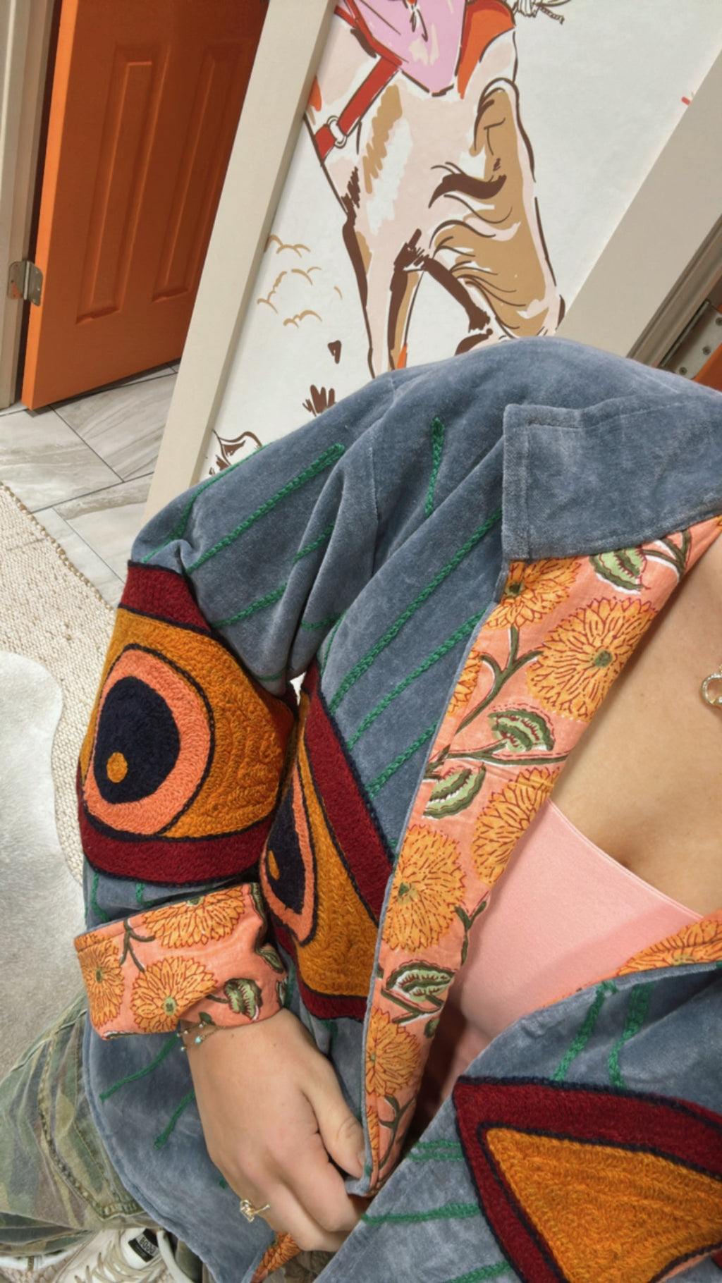 These are one-of-a-kind velvet embroidered jackets with a breathtaking design on the inside that you can even make reversible.One size fits all - longer arms individuals, you’ll want to roll into a cuff. Jackets are reversible.