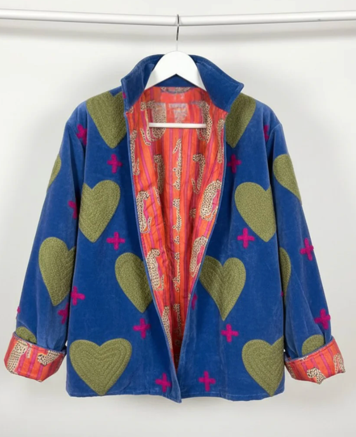 These are one-of-a-kind velvet embroidered jackets with a breathtaking design on the inside that you can even make reversible. Chest is 23in, Sleeve 20in. One size fits all - longer arms individuals, you’ll want to roll into a cuff. Jackets are reversible.